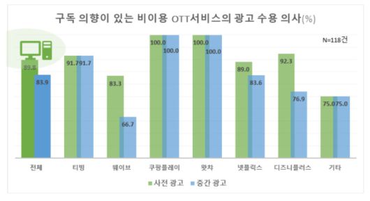 광고 수용의사는 OTT 이용행태에 따라, 비이용자-계정공유 이용자-구독 이용자 순으로 높게 나타나 현재 지불비용이 적을수록 광고 수용의사가 높았다.