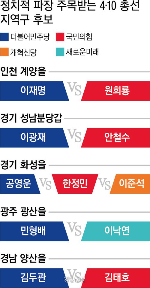 오는 4·10 총선 결과에 따라 차기 대선 구도에 지대한 영향을 미칠 수 있는 선거구들이다. 모두 대선 후보급 주자들이 출마했다. 당선되면 대선가도에 탄력을 받겠지만 낙선하면 정치적 미래가 불투명해진다. 총선에서 단순히 1석 이상의 의미를 가지는 선거구를 8일 짚어봤다.