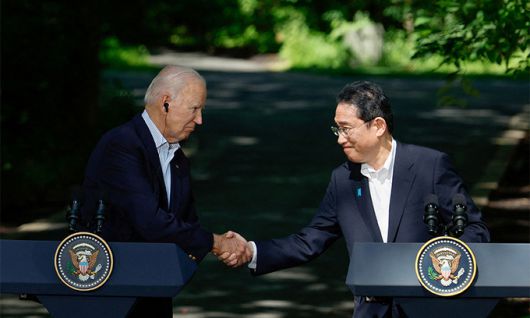 지난 2023년 8월 18일(현지시간) 미국 캠프 데이비드에서 악수하는 조 바이든 미국 대통령과 기시다 후미오 일본 총리. 로이터연합뉴스 |