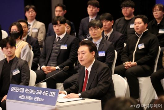 윤석열 대통령이 16일 오전 대전 유성구 ICC호텔에서 '대한민국을 혁신하는 과학의 수도, 대전'를 주제로 열린 열두 번째 국민과 함께하는 민생토론회에서 모두발언을 하고 있다. 이 자리에서 윤 대통령은 국가연구개발에 참여하는 이공계 석·박사들이 학업에 매진할 수 있도록 매달 각각 80만원과 110만원의 장학금을 지급하고 대통령과학장학생 선발도 대학원생으로 확대하겠다고 약속했다. 사진/=뉴스1 사진/=김기태 기자 |