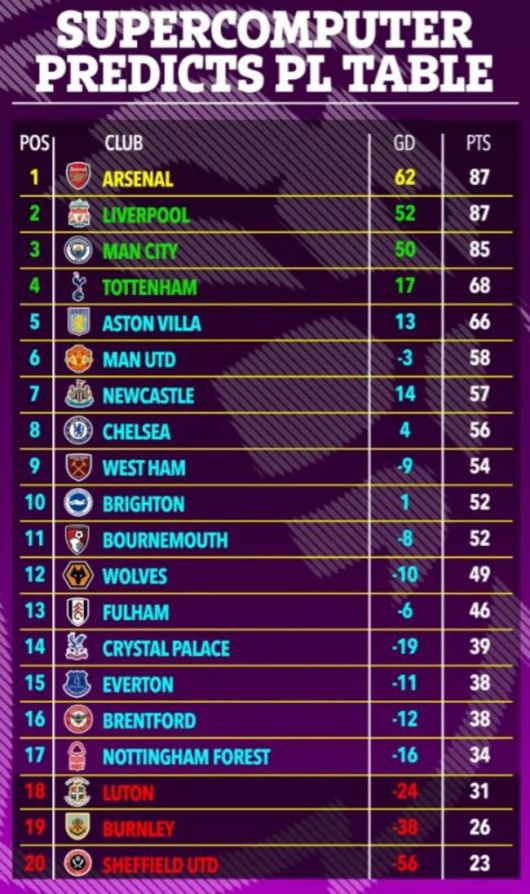 영국 '더 선'은 8일(한국시간) "한 슈퍼컴퓨터가 PL 레이스를 예측했다. '베팅 엑스퍼트' 슈퍼컴퓨터 '베시'는 여러 데이터를 활용해 10만 차례에 걸쳐 최종 순위와 관련된 시뮬레이션을 진행했다"라며 슈퍼컴퓨터 예측 결과를 표로 만들어 공유했다.