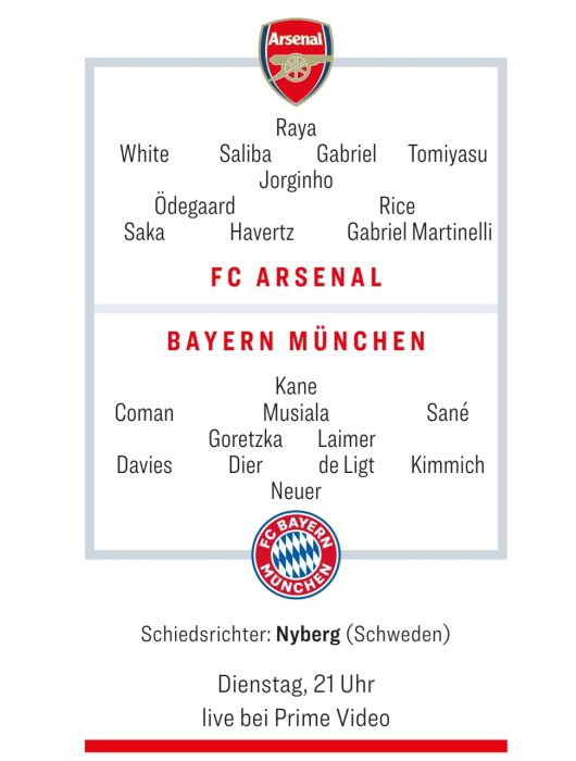 뮌헨은 최근 챔피언스리그 토너먼트에서 아스널과 치른 3경기를 모두 5-1 대승으로 장식하며 강한 면모를 보여줬지만, 올시즌 아스널은 프리미어리그 선두에 위치하며 우승 경쟁팀으로 분류됐기에 쉽게 승자를 예측하기 어려운 상황이다.