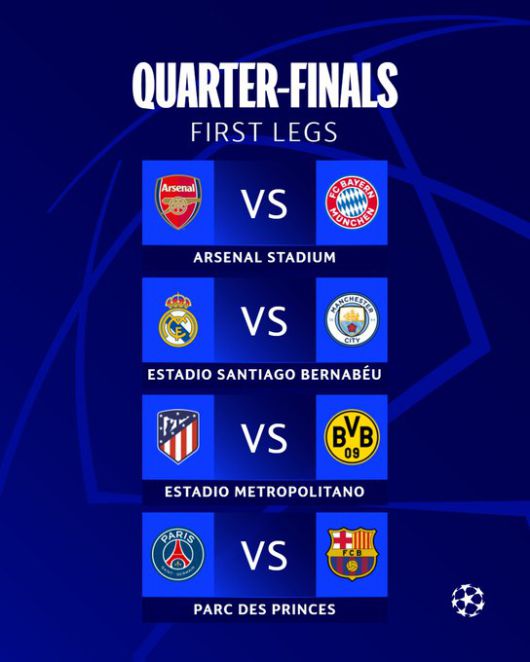 오는 10일 오전 4시엔 잉글랜드 런던에 있는 에미레이츠 스타디움에서 아스널과 바이에른 뮌헨의 8강 1차전이 열린다. 같은 시각, 스페인 마드리드에 있는 산티아고 베르나베우에서 레알 마드리드와 맨체스터 시티의 경기가 예정돼 있다.
