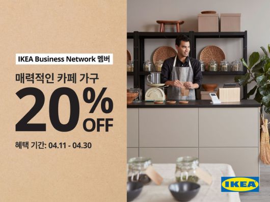 행사 기간 이케아의 비즈니스 고객 대상 무료 멤버십 프로그램 '이케아 비즈니스 네트워크' 멤버에게는 카페, 레스토랑, 휴게 공간을 단장하기 좋은 가구 제품 115종에 대해 20% 할인 혜택이 제공된다.