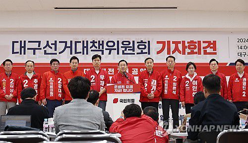 (대구=연합뉴스) 박세진 기자 = 국민의힘 대구선거대책위원회는 총선을 하루 앞둔 9일 당사 강당에서 기자회견을 열고 "야당 폭주를 막을 수 있는 최소한의 의석은 지켜달라"고 시민들에게 호소했다.