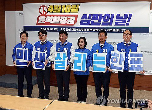 (울산=연합뉴스) 허광무 기자 = 울산에서 제22대 국회의원 선거에 출마하는 더불어민주당 후보들은 "위대한 국민 승리 드라마를 투표로 완성해 달라"고 당부했다.