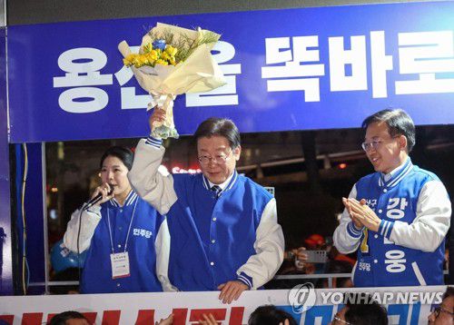 (서울=연합뉴스) 신준희 기자 = 더불어민주당 이재명 대표가 9일 용산역 앞 광장에서 열린 '정권 심판, 국민승리 총력 유세'에서 지지자가 선물한 꽃다발을 들어 보이고 있다. 2024.4.9