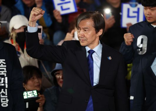 제22대 국회의원선거를 하루 앞둔 9일 오후 조국혁신당 조국 대표가 서울 종로구 세종문화회관 앞에서 선거 유세를 하고 있다. [연합] |