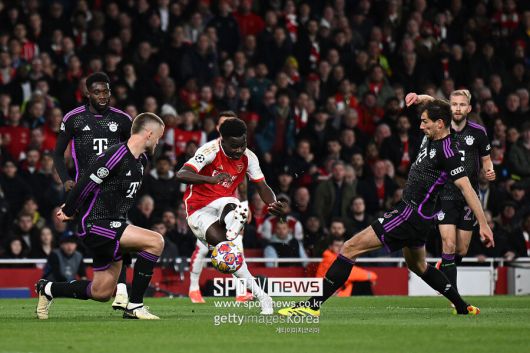 아스널은 짧은 패스 플레이와 페널티 박스 안팎에서 슈팅으로 바이에른 뮌헨을 흔들었다. 전반부터 난타전이 예고됐다. 홈 팬들 분위기를 등에 업은 아스널이 기선 제압에 성공했다. 측면에서 볼을 전개하며 빈틈을 노렸는데 볼을 빼앗긴 이후에도 빠르게 바이에른 뮌헨을 압박했다. 이후 부카요 사카가 바이에른 뮌헨 밀집 수비를 뚫어내고 골망을 출렁였다.