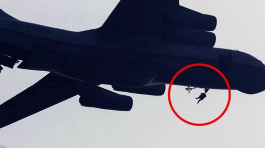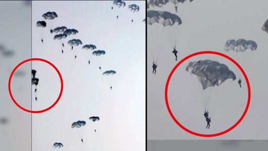 더 충격적인 장면은 수송기 앞부분에 걸려있는 군인 모습입니다. 사진을 보면 공수부대원들이 낙하하는 수송기 앞부분에 사람이 걸려있는 모습이 보이는데, 낙하를 시도했던 군인이 역풍에 휘말려 비행기 앞부분에 걸렸거나 앞쪽 수송기에서 낙하한 군인이 너무 센 바람 때문에 뒤쪽 수송기에 그대로 부딪힌 것으로 보입니다.