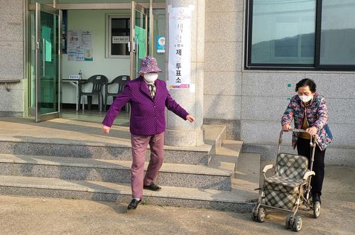 노인용 보행기 끌고 투표소 찾은 유권자 |