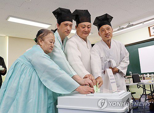 도포를 입고 갓을 쓴 논산 양지서당 유정욱 훈장과 그의 가족은 투표를 마친 뒤 투표소 밖에서 함께 기념사진을 찍기도 했다.
