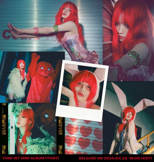 이미지 속 우기는 비비드한 레드 헤어로 강렬한 아우라를 발산했다. 컬러풀한 액세서리와 하트 모양의 포인트 메이크업으로 키치한 매력을 극대화했다.
