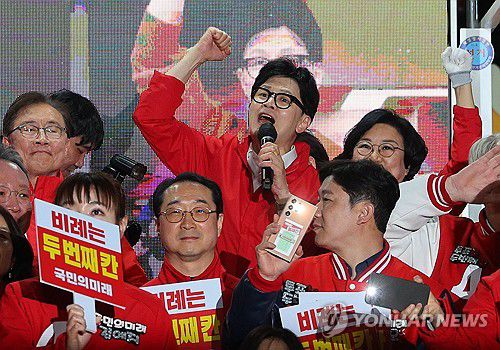국민의힘 한동훈 비상대책위원장 겸 총괄선거대책위원장은 이날 전체 후보들에게 '마지막 비상 요청' 메시지를 보내 "젖 먹던 힘까지 총동원해 투표 독려에 매진해 달라"고 당부했다.