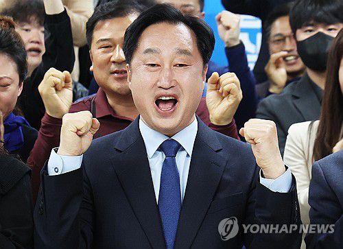 논란의 중심에 섰던 김 후보는 캠프 사무실에서 출구조사를 지켜보다가 결과가 나온 순간 자리를 박차고 일어난 뒤 뒤를 돌아 지지자들을 보며 주먹을 쥐고 "와"하고 환호했다.