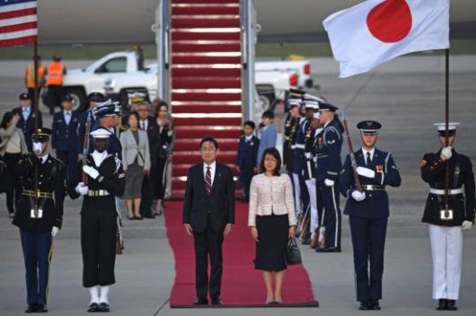 기시다 후미오 일본 총리(가운데 왼쪽)와 부인 유코 여사가 8일(현지시간) 미국 메릴랜드주 앤드루스 합동기지에 도착해 의장대의 환영을 받고 있다. [이미지출처=연합뉴스] |