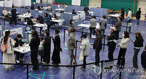 투표 기다리는 유권자와 투표 마친 유권자 |