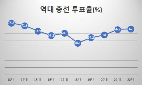 10일 중앙선거관리위원회에 따르면 이번 22대 총선 투표율은 전체 유권자 4428만11명 가운데 2966만2313명이 투표를 해 67.0%를 기록했다. 마의 70%선은 못넘었지만 지난 21대 총선 투표율(66.2%)을 넘었다. 1992년 14대 총선(71.9%) 이후 32년만의 최고 기록이다.