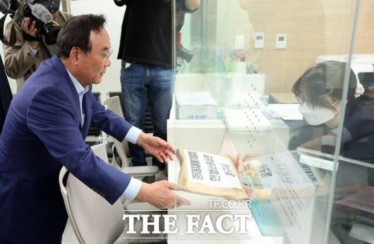 배조웅 중소기업중앙회 수석부회장이 지난 1일 오전 서울 종로구 헌법재판소 앞에서 중대재해처벌법 헌법소원심판 청구 기자회견을 마치고 민원실에 청구서를 제출하고 있다. /뉴시스 |