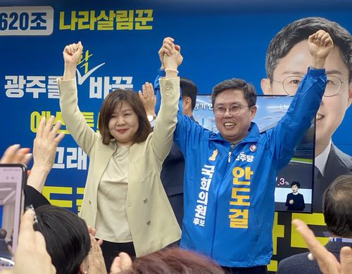 환호하는 더불어민주당 광주 동남을 안도걸 후보 |