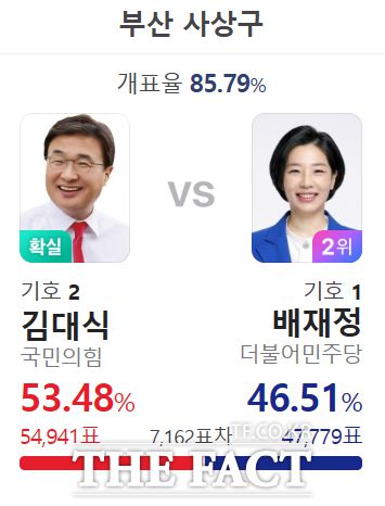 [더팩트ㅣ부산=조탁만 기자] 김대식 국민의힘 후보가 제22대 총선 부산 사상구 선거구에서 당선이 확실시된다.