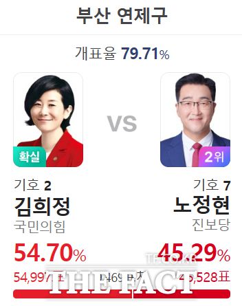 11일 중앙선거관리위원회에 따르면 이날 오전 0시 13분 기준 부산 연제구 선거구에서 김희정 국민의힘 후보가 54.70%(5만4997표) 득표율로 당선이 확실시됐다.