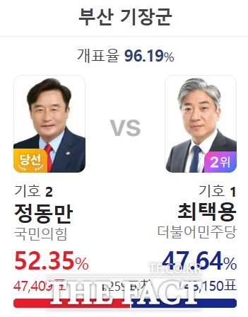 11일 중앙선거관리위원회에 따르면 이날 오전 0시 49분 기준 부산 기장군 선거구에서 정동만 국민의힘 후보가 52.35%(4만7409표) 득표율로 당선됐다.