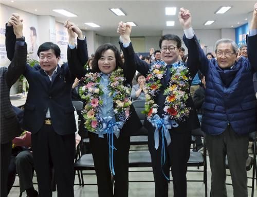승리 화환 목에 건 임호선 당선인 부부 |