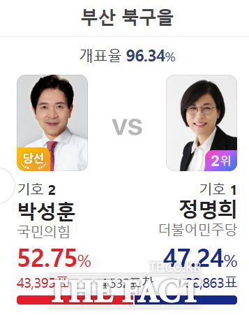 11일 중앙선거관리위원회에 따르면 이날 오전 2시 16분 기준 부산 북구을 선거구에서 박성훈 국민의힘 후보가 52.75%(4만 3395표) 득표율로 당선됐다.