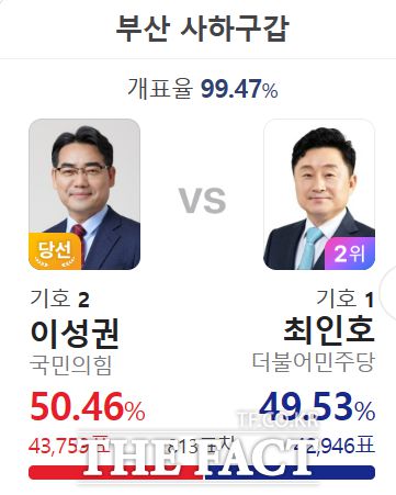 11일 중앙선거관리위원회에 따르면 이날 오전 2시 47분 기준 사하구갑 선거구에서 이성권 국민의힘 후보가 50.46%(4만 3759표) 득표율로 당선됐다.