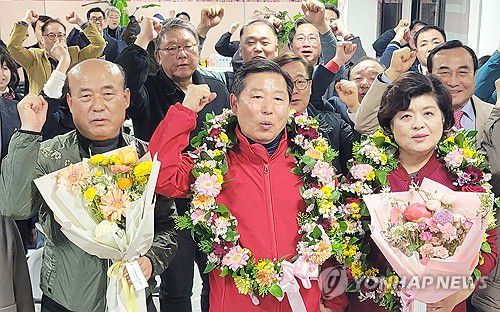 원주 첫 3선 연임 기뻐하는 송기헌 후보 |