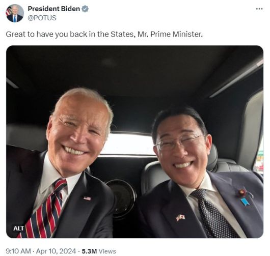 교도통신은 바이든 대통령은 기시다 총리와 전용차 비스트 뒷좌석에 나란히 앉아 찍은 사진을 자신의 엑스 계정에 게재했다고 10일 보도했다. 게시글에는 "미국에서 다시 만나게 돼 반갑습니다, 총리"라는 문구가 적혀 있다.