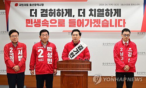 (울산=연합뉴스) 허광무 기자 = 울산지역에서 치러진 제22대 국회의원 선거에서 국민의힘 소속으로 당선된 4명은 "민심을 하늘같이 받들어 나라와 울산의 더 큰 발전과 변화를 선도하는 선봉장이 되겠다"고 각오를 밝혔다.