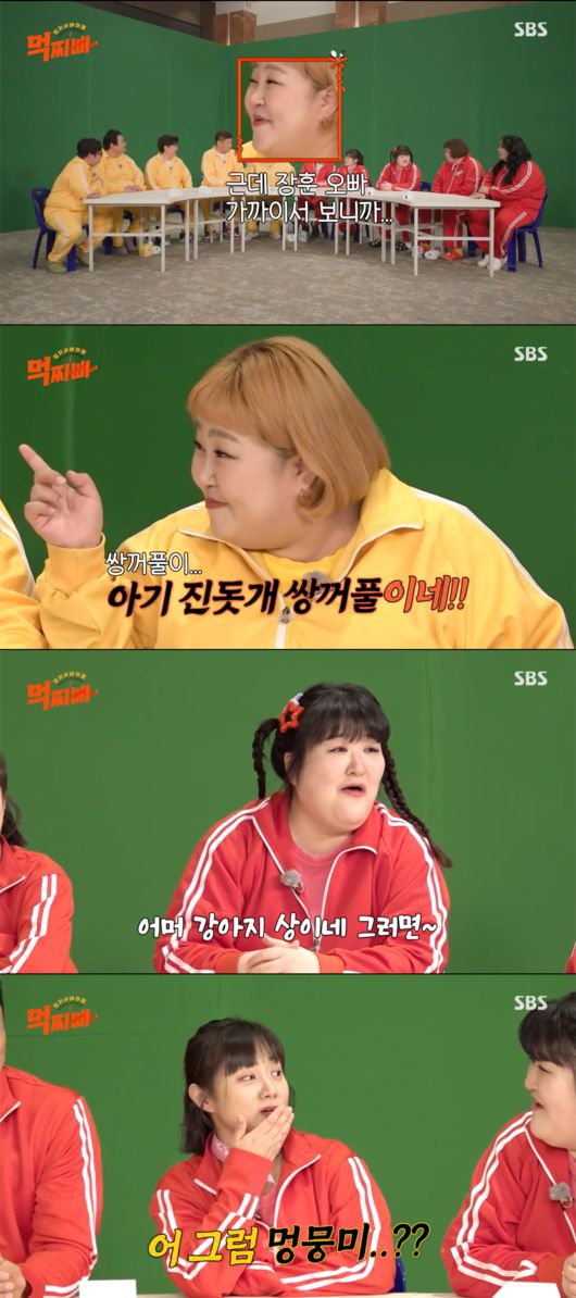 멤버들은 식사를 하기 위해 모였고, 홍윤화는 서장훈을 보고 “장훈이 오바 가까이 보니까 눈이 아기 진돗개 쌍꺼풀이다”라고 말해 웃음을 자아냈다. 이국주는 “강아지 상이네”라고 덧붙였고, 박나래 역시 “어 그럼 멍뭉미?”라고 말해 눈길을 끌었다.