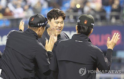 기뻐하는 류현진과 선수들 |