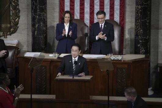 34분간 이어진 기시다 총리의 의회 연설에 참석한 미 의원들은 수 차례 기립박수를 치며 환호를 보냈다. 일본 총리의 미 상하원 합동연설은 2015년 아베 신조 전 총리 이후 9년 만이다.