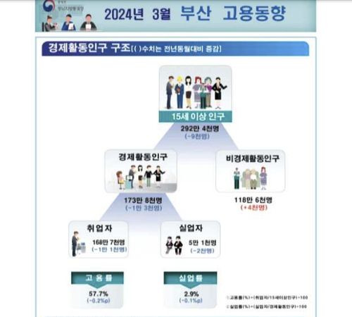 12일 동남지방통계청의 '2024년 3월 부산시 고용동향' 자료에 따르면 지난달 부산지역 15세 이상 취업자는 168만7천명으로 지난해 3월보다 1만1천명, 0.7% 감소한 것으로 나타났다.