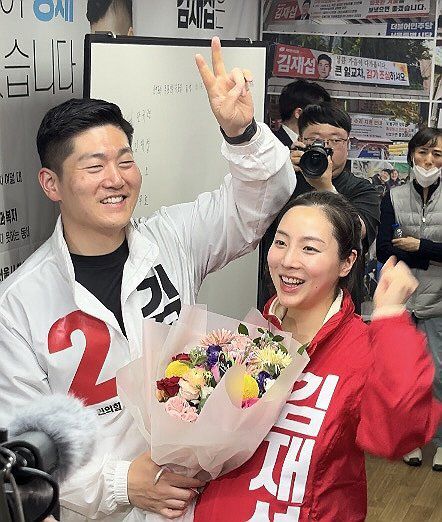 서울 도봉갑에서 승리한 국민의힘 김재섭 후보가 11일 서울 도봉구 쌍문동 선거사무소에서 축하 꽃다발을 들고 있다. 김재섭 당선인 측 제공 |