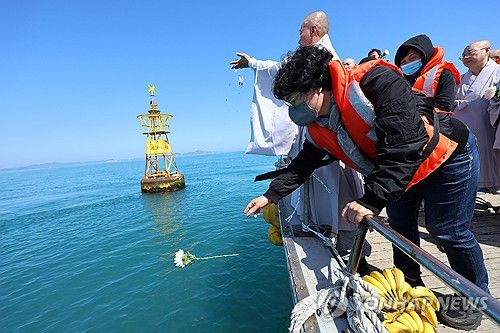 제례와 기도회를 마친 유가족과 스님들은 세월호 침몰 해점을 표시하는 노란색 부표 주변에 국화를 띄우며 더는 아픔이 없는 세상을 염원했다.