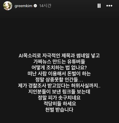 김그림은 “유튜버들이 AI목소리로 자극적인 제목과 썸네일을 넣고 가짜뉴스를 만들고 있다”며 “어떻게 조치하는 법 없냐”고 질문했다.