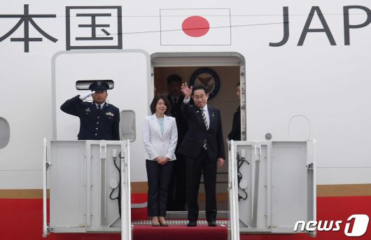 미국을 국빈 방문중인 기시다 후미오 일본 총리 부부가 11일(현지간) 노스캐롤라이나주에 소재한 토요타와 혼다 자동차 조립공장을 방문하기 위해 메릴랜드주 앤드류공항서 전용기에 오르며 환송객들에게 작별 인사를 하고 있다. 2024.04.12 ⓒ AFP=뉴스1 ⓒ News1 김성식기자 |