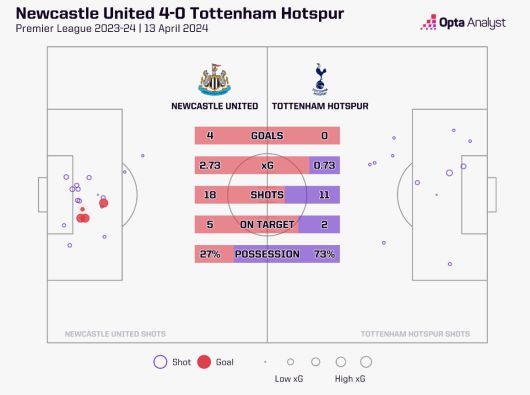 일반적으로 공 점유율이 높으면 상대가 공을 소유하는 시간은 줄어들고, 이는 공격 허용 횟수 감소로 이어진다. 그러나 통계와 달리 토트넘과 뉴캐슬의 슈팅 숫자는 11 대 18로 점유율이 낮은 뉴캐슬이 훨씬 더 많았다.