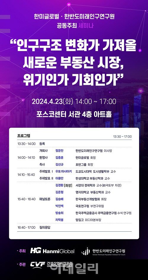 [이데일리 김아름 기자] 건설사업관리(PM) 전문기업 한미글로벌은 인구문제 전문 민간 싱크탱크 한반도미래인구연구원과 공동으로 ‘인구구조변화가 가져올 새로운 부동산 시장, 위기인가 기회인가’라는 주제의 세미나를 오는 23일 서울 강남구 포스코센터 아트홀에서 개최한다고 15일 밝혔다.