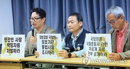 이들은 세월호 참사 10주기를 하루 앞둔 이날 기자회견에서 국정원이 시민사회의 동향을 파악하고 과거 청와대에 대응 계획을 제안하는 등 불법 사찰한 정황을 사회적참사특별조사위원회가 일부 확인했으나 국정원의 방해로 법적 책임을 묻지 못했다고 주장했다.
