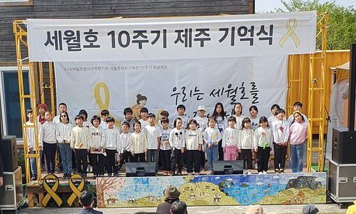보물섬교육공동체 소속 학생 32명이 16일 오후 3시 제주시 봉개동 제주4·3평화공원으로 가는 길가 세월호 제주기억관에서 열린 ‘세월호 10주기 제주기억식’에서 창작고 ‘민들레 바람’을 함께 불렀다. 노래는 잔잔했고, 참석한 이들의 마음을 적셨다. 이날 학생들은 마이크를 잡고 ‘저희가 기억할게요’, ‘다시는 일언 이이 안 이어났으면 좋겠어요’ ‘행복한 사회를 만들어주세요’, ‘우리가 기억할게요’라는 말을 이어갔다.