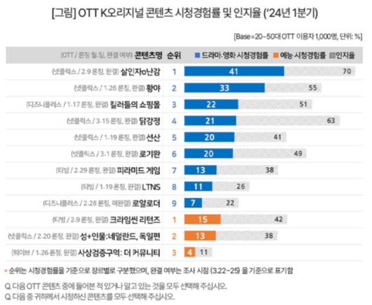 시청경험률 20% 이상의 상위 6개 콘텐츠 모두 ‘드라마∙영화’ 분야로, ‘예능’ 콘텐츠의 시청경험률은 상대적으로 부진했다고 사측은 분석했다. 또 ‘킬러들의 쇼핑몰(디즈니플러스)’을 제외한 5개가 모두 넷플릭스의 오리지널 시리즈였다.