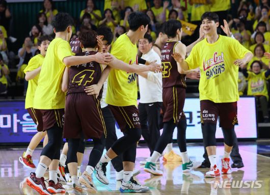 [창원=뉴시스] 최진석 기자 = 16일 오후 경남 창원 성산구 창원실내체육관에서 열린 2023-2024 KBL 4강 플레이오프 1차전 창원 LG 세이커스와 수원 KT 소닉붐의 경기. LG 이재도가 득점 후 동료들과 기뻐하고 있다. 2024.04.16. myjs@newsis.com