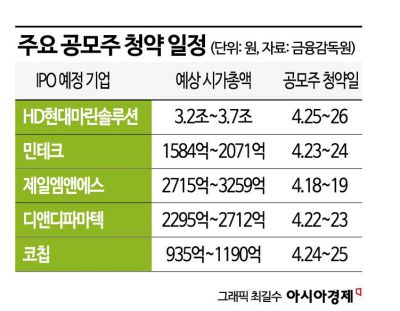 전 세계 주요 국가 증시가 조정 흐름을 보이는 가운데 기업공개(IPO) 시장에 대한 관심은 여전하다. 금융당국이 상장 첫날 가격 변동 폭을 확대한 이후로 공모주 투자 기대 수익률이 높아졌다. 덕분에 공모주를 받기 위한 청약 경쟁이 치열하다. 올해 2분기에는 제일엠앤에스·민테크·디앤디파마텍·코칩·에이치디현대마린솔루션 등이 상장을 추진한다.