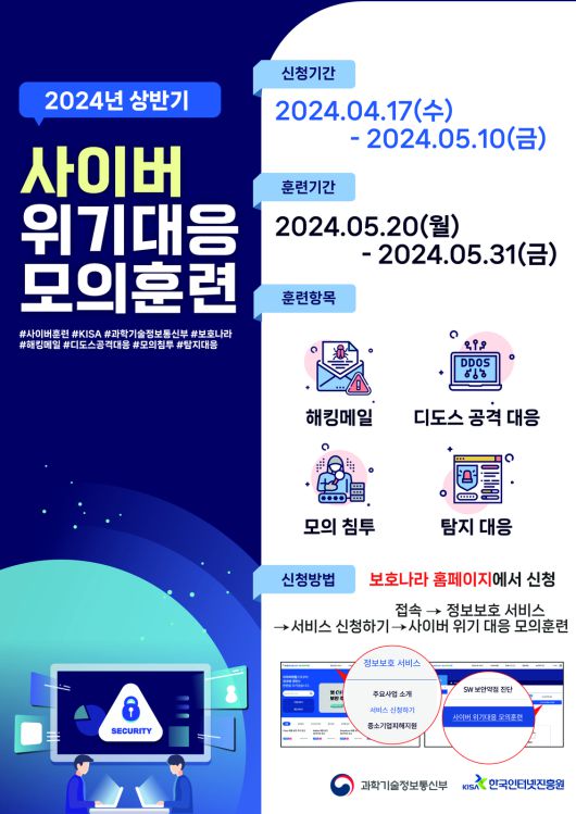 한국인터넷진흥원(KISA)이 내달 10일까지 과학기술정보통신부와 함께 올해 상반기 사이버 위기 대응 모의훈련 참여 기업을 모집한다.