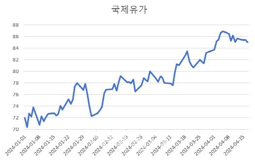 17일 인베스팅닷컴에 따르면 뉴욕상업거래소(NYMEX)에서 거래되는 서부텍사스산원유(WTI) 5월 인도분은 16일 배럴당 85.36달러로 마감해 올해 1월1일 71.97달러보다 13.39달러 올랐다. 올해 유가 상승은 예멘 후티 반군의 홍해 도발과 석유수출기구플러스(OPEC+) 회원국의 감산 연장과 이란, 이스라엘 충돌 등이 겹친 영향으로 풀이된다. 특히 이란은 걸프 지역 원유 수출의 9.3%를 차지해 향후 이란과 이스라엘 무력 충돌 양상에 따라 국제유가가 배럴당 100달러를 넘을 것이라는 관측도 나온다.